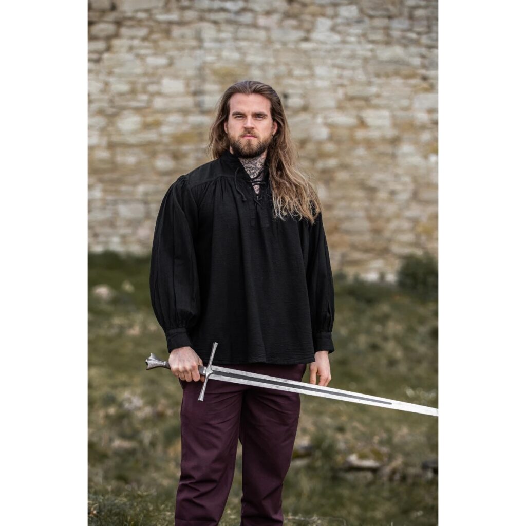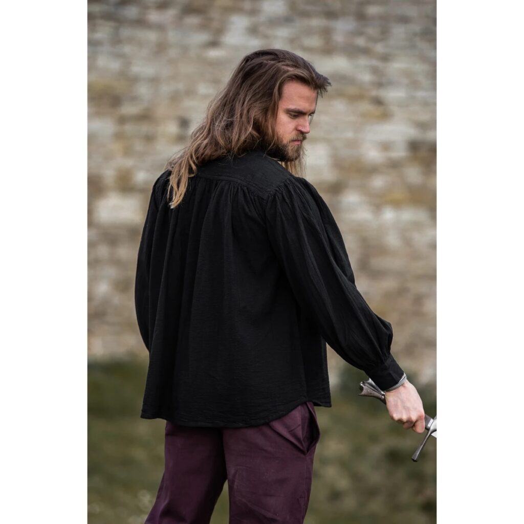 Dieses schwarze, mittelalterliche Hemd ist aus Wolle – ein Must-Have für jeden, der sich für Mittelalterkleidung interessiert. Es hat einen Stehkragen und eine Schnürung. Das Hemd hat weite Ärmel. Es ist bequem geschnitten und lässt sich vielseitig kombinieren.