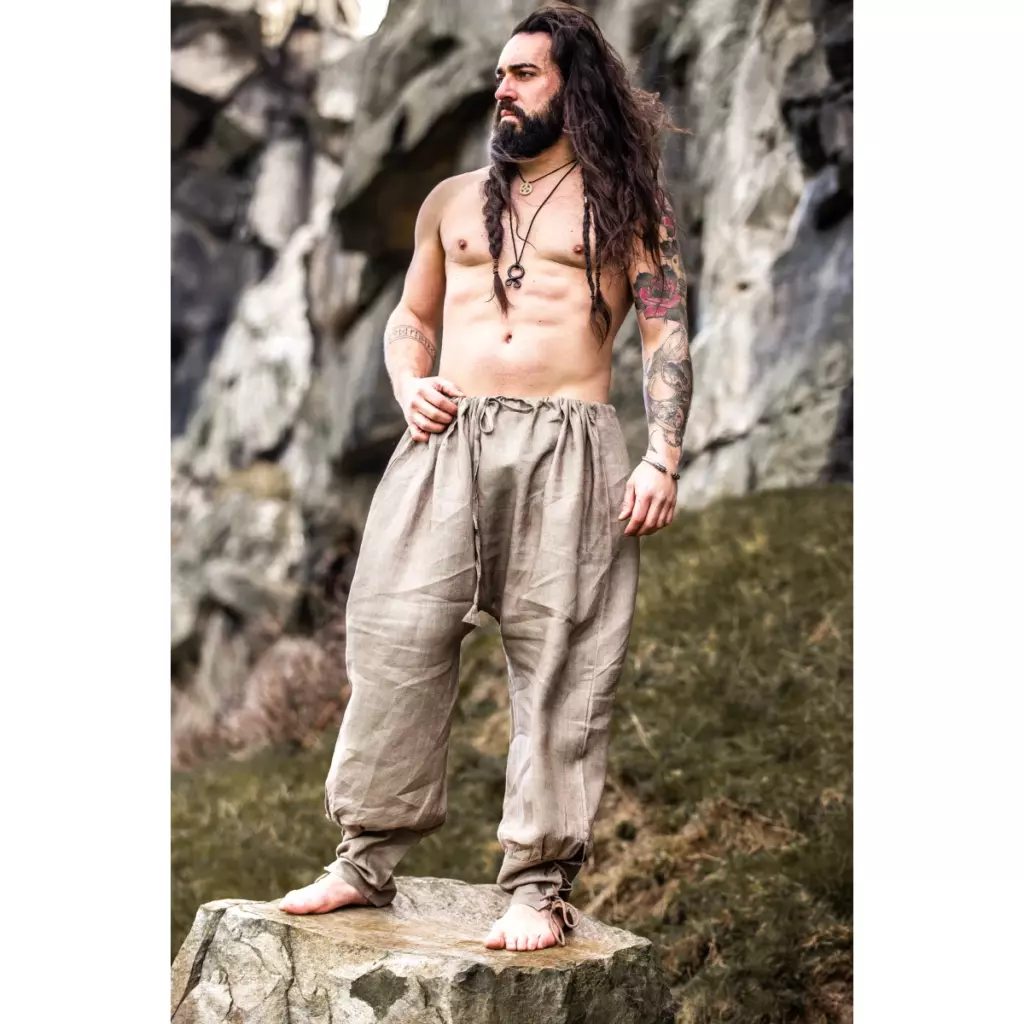 Wikingerhose Wodan aus LeinenEine weite Rushose darf in keinem Wikinger Kleiderschrank fehlen!Die Wikinger Rushose aus Leinen ist sehr voluminös geschnitten und ist am Bund besonders weit und kann dank des Tunnelzugs individuell angepasst werden. Der Tragekomfort ist daher besonders hoch. Unterhalb des Knies verengt sich die Hose und kann geschnürt werden. Rushosen werden oftmals zu einer authentischen Wikinger Darstellung mit Wadenwickeln kombiniert. In unserem Wikinger Online Shop können Sie Wadenwickel aus Wolle oder Baumwolle separat erwerben. Die Hose ist ohne Taschen versehen.Wir empfehlen die Hose bei höchstens 30° im Feinwaschgang zu waschen. Die Hose ist großzügig geschnitten da es bei Leinenstoffen grundsätzlich sein kann, dass diese nach dem ersten Waschen noch ein wenig eingehen. Sie lässt sich aber ohnehin durch den weiten Schnitt und dem Tunnelzug perfekt anpassen. -