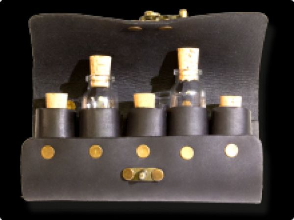 Dieses wunderbare und unabkömmliche Accessoire des Heilers, Alchiemisten, Kochs, Magiers ist aus echtem Leder und kann mittels zweier Riemen am Gürtel befestigt werden. Die fünf kleinen Fläschchen sind aus Glas und mit einem Korken veschlossen. Der Verschlus dieser Tranktasche ist mit einem Riegelverschluss versehen.