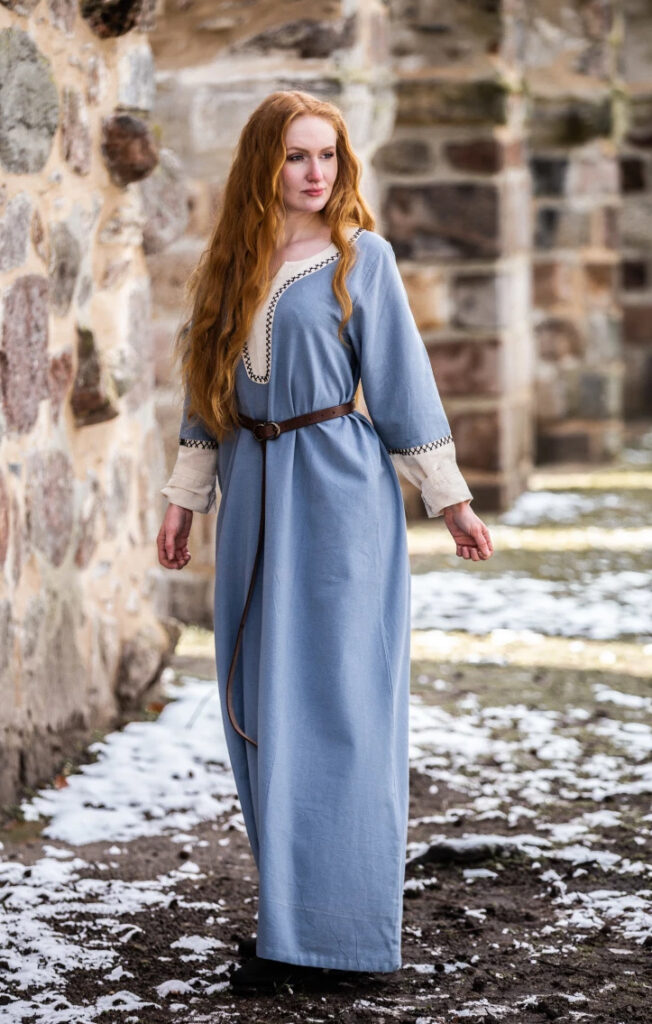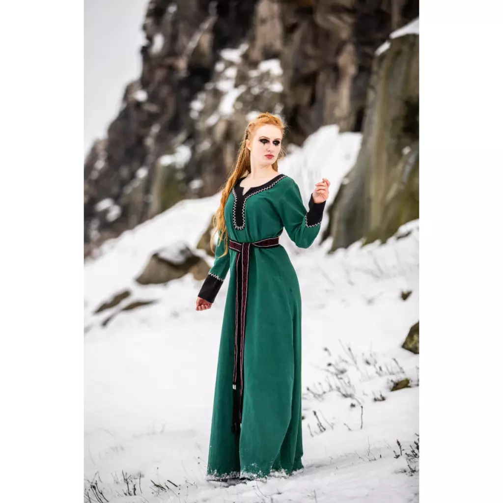 Das auffällige zweifarbige Design fängt die Essenz der Wikinger-Mode ein und verleiht dem Kleid einen zeitlosen und unverwechselbaren Look. Die atemberaubende Handstickerei, die dieses Kleid schmückt, ist das Ergebnis stundenlanger Arbeit und Hingabe. Jedes Muster wurde sorgfältig ausgewählt, um ein Kunstwerk zu schaffen, das die Aufmerksamkeit auf sich zieht.