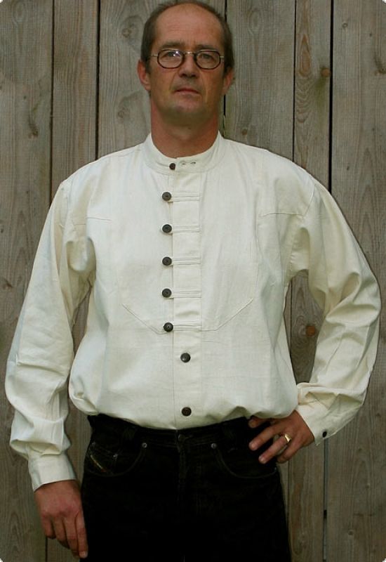 Mittelalter Hemd aus dem 14 Jhrd. in naturbeige ist ein Stehkragenhemd mit 5 Schlaufen durchgehend zu öffnen mit Rückensattel und Falte. Dieses Mittelalter Stehkragenhemd ist ein altbairisches Mittelalter Hemd leicht modernisiert, ursprünglich ein Stehkragen-Hemd mit Knopfleisten, das von uns auf Schlaufen umgerüstet worden ist. Das Mittelalter Stehkragen-Hemd ist vielseitig einsetzbar, sowohl als Trachten-Hemd wie auch als Ritter-Hemd unter der Rüstung oder nur als mittelalterliches Hemd. Als Vorlage diente ein altes Bauern-Hemd, das bei einem Antiquitätenhändlern auf der Auer Dult (der Kultmarkt in München seit über 600 Jahren) erworben wurde. Wir benutzen Stoffe aus Baumwolle, die Rohbaumwolle aus konventionellem Anbau wird ohne chemische Aufrüstung verarbeitet. Gewebt wird diese Baumwolle nach einer alten traditionellen Webart Nepals.