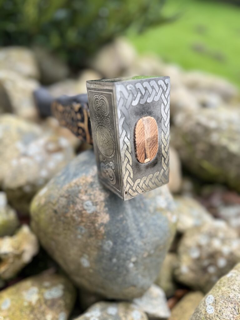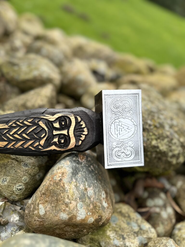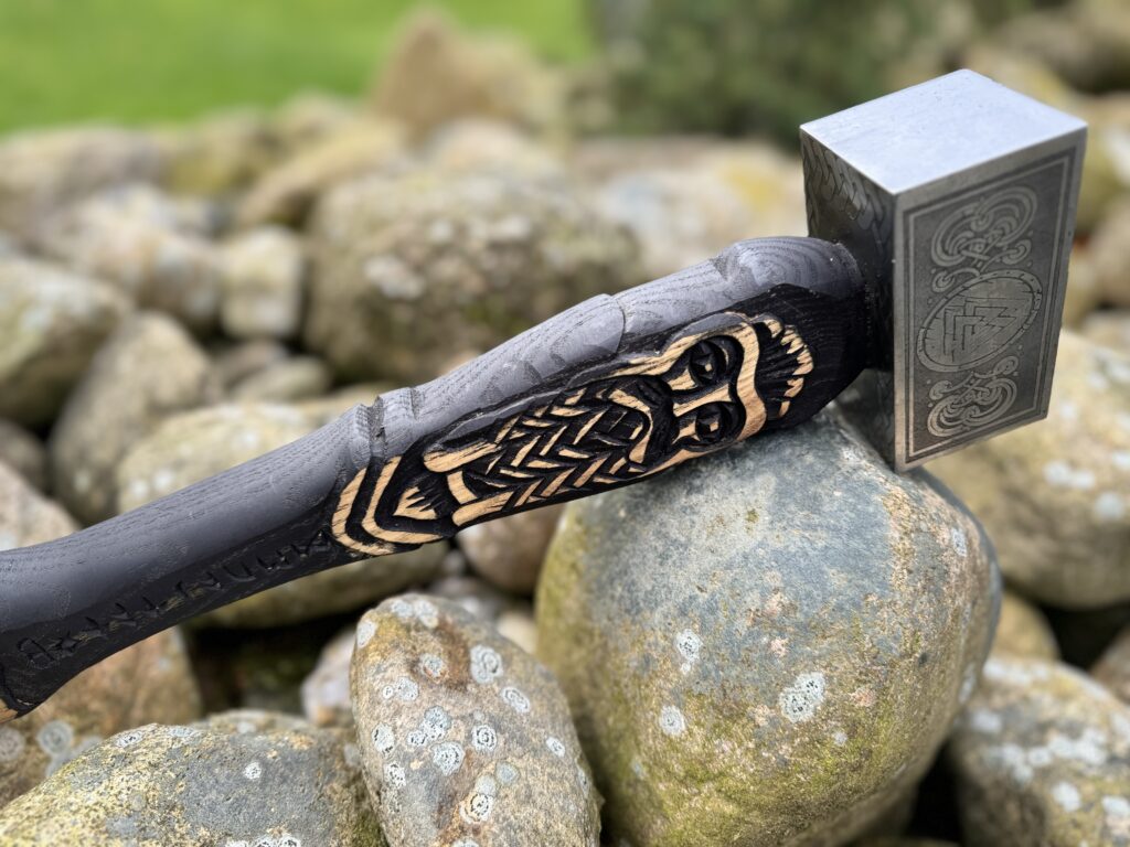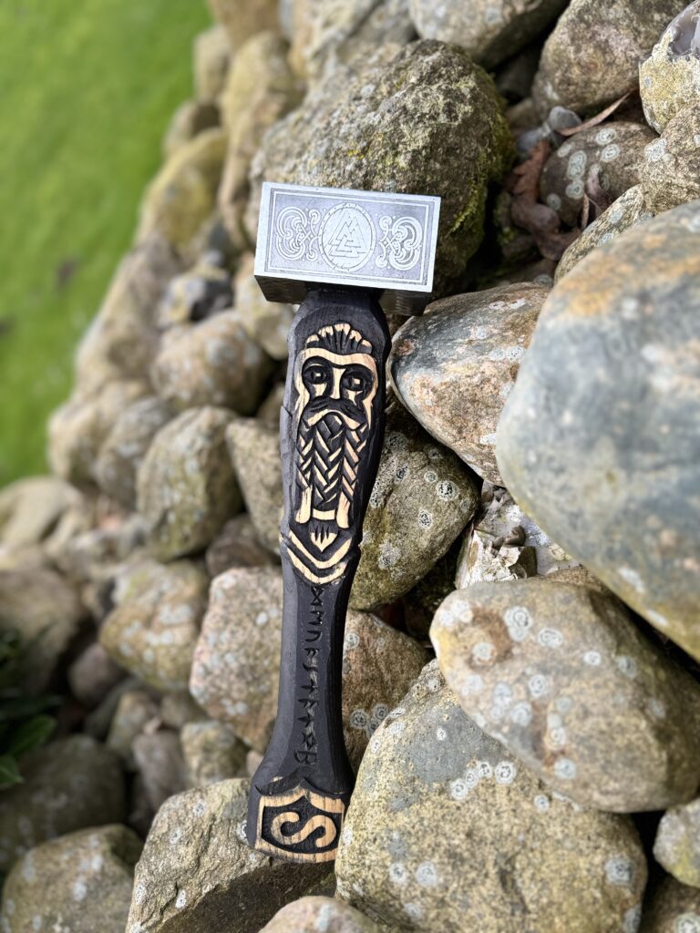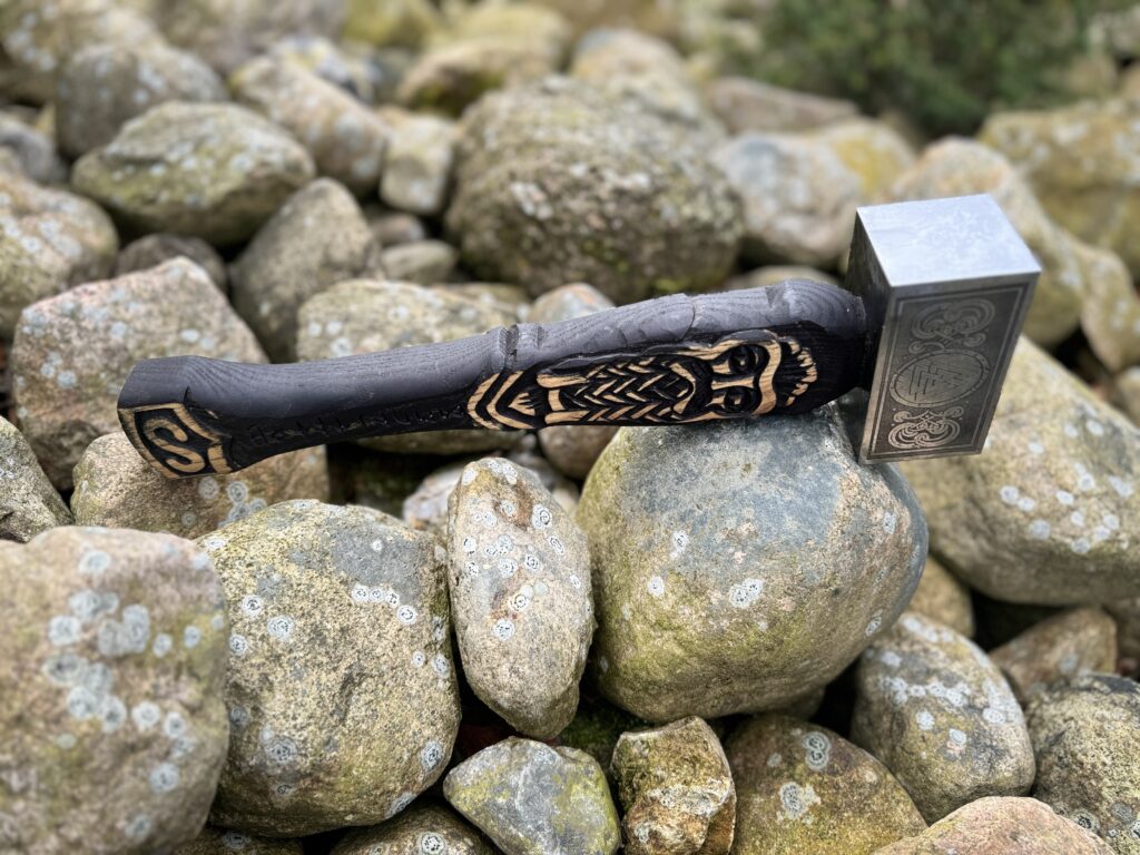 Der handgeschnitzte Griff sorgt für eine angenehme Haptik und die aufwendige Blattverzierung gibt dem Hammer das gewisse Etwas, eines Gittes würdig. Holen Sie sich jetzt ein Stück Wikingerkultur nach Hause!