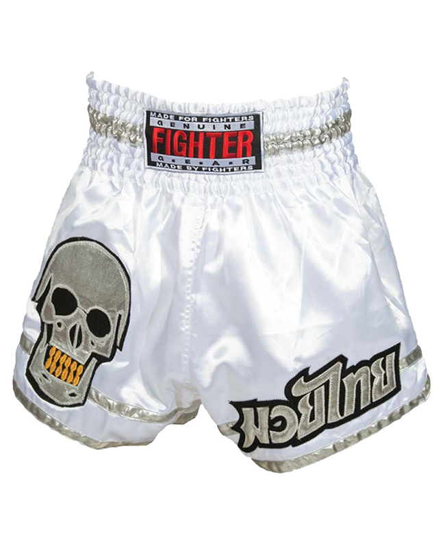 - Original thailändische Muay Thai Short aus weichem Satin in weiß mit Totenkopf auf einem Hosenbein