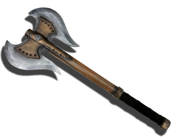 Wer es darstellen kann, darf diese Axt gern einhändig führen. Die schlichte Form und der gebundene Axtschaft machen diese Doppelblattaxt zum perfekten Spielpartner für den mutigen Herren Zwerg oder Wikinger.