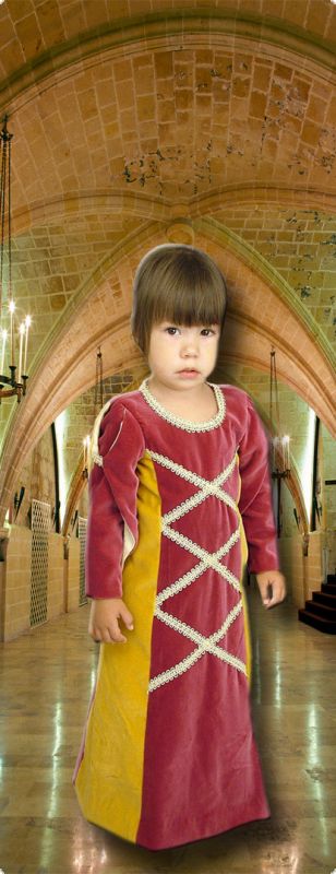Gotisches Kinderkleid ist vom Samt abgenäht und längt bis zur Erde. Das Kleid hat Doppelärmel – die lange enge Unterärmel und kurze Oberärmel, die mit einer Schleife verbunden sind.