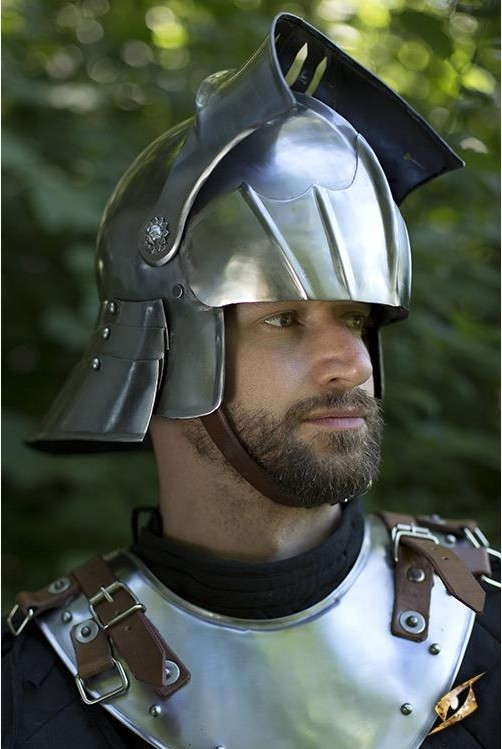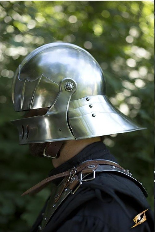 EINZELHEITEN Der Schaller ist ein Schutzhelm mit beweglichem Visier, der eng an den historischen Helm aus dem 15. Jahrhundert in Deutschland angelehnt ist. Das Visier ist verstärkt und so geformt, dass es bequem um das Gesicht passt und dennoch eine gute Luftzirkulation durch seine Belüftungslöcher bietet. Dieser Helm ist mit Details übersät, die sowohl schön als auch praktisch sind. Tragen Sie den Schirm dank seines blumenverzierten Scharniers über der Stirn oder dem Gesicht oder erfreuen Sie sich an der dekorativen Verstärkungsplattierung entlang der Stirn. Eine flexible Hummer-Halsplatte schützt den Hinterkopf hinter den Ohren. Sichern Sie den Sallet-Helm, indem Sie den Lederriemen unter dem Kinn festziehen und den Helm an Ort und Stelle halten. Dieses Rüstungsteil besteht aus 1 mm dickem Weichstahl und erstklassigen Lederriemen und -beschlägen und ist so gebaut, dass es dem Missbrauch eines LARP oder einer Reenactment mit regelmäßiger Leder- und Metallrüstungspflege standhält. Erhältlich in den Größen Medium und Large. – M58 L60 (ca.)