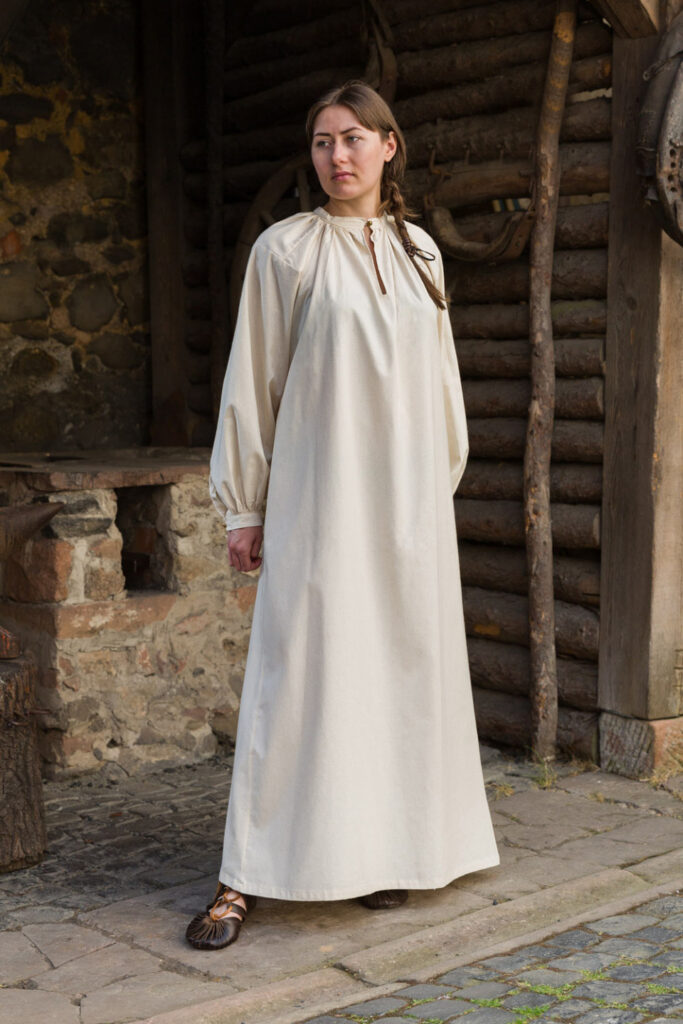 Das Kleid verfügt über einen schmalen Ausschnitt, der das Schlüsselbein betont. Seine kurzen Ärmel tragen zur Vielseitigkeit des Kleides bei und ermöglichen uneingeschränkte Beweglichkeit von Händen und Armen – ideal sowohl für die Arbeit als auch für Outdoor-Aktivitäten. Geschickt platzierte Keileinsätze unter den Armen und entlang der Seitennähte verbessern nicht nur die Beweglichkeit, sondern bieten auch ein bemerkenswertes Maß an Komfort.